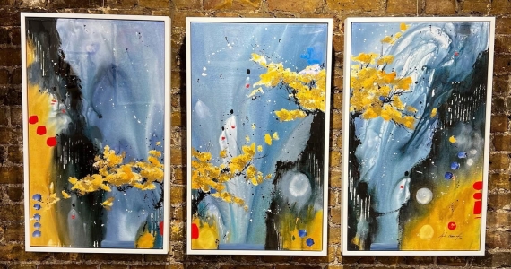 "The Golden Reach is a part of my ongoing Journey series. In this piece we have the arms of branches reaching across all three canvases, and in stark contrast to the very dark brooding sky which shows the gravitas and weight of the journey, we have the brightest gold - shining in purity and strength. We often use gold for wedding bands, and it is that same kind of lifetime sentiment in this piece."